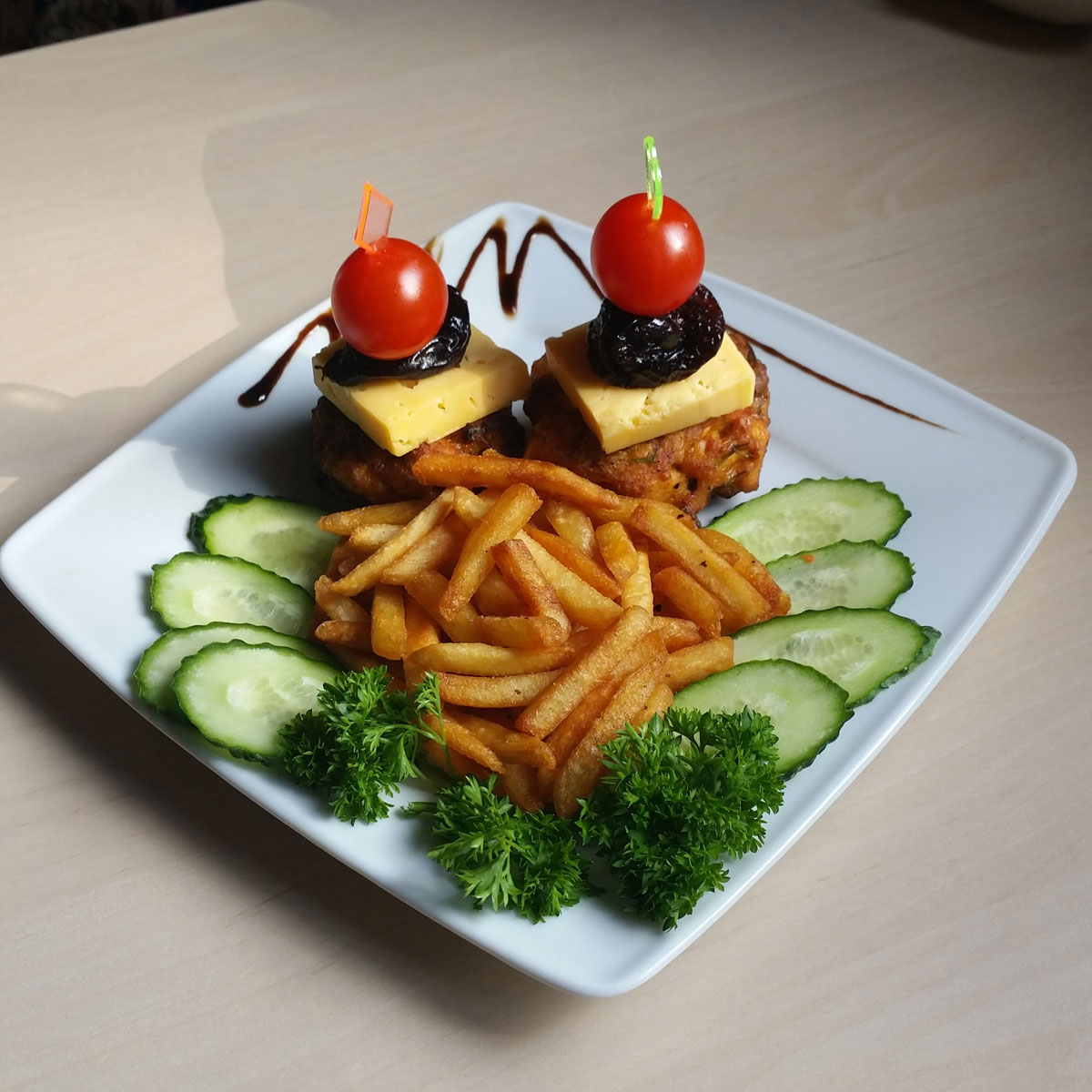 нежный бифштекс из птицы подается с сыром и черносливом, дополнен картофелем фри и ломтиками свежего огурца