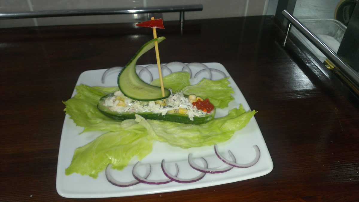 крабовое мясо, яйцо, кукуруза, огурец, перец болгарский, салат листовой, икра лососевая, лук красный