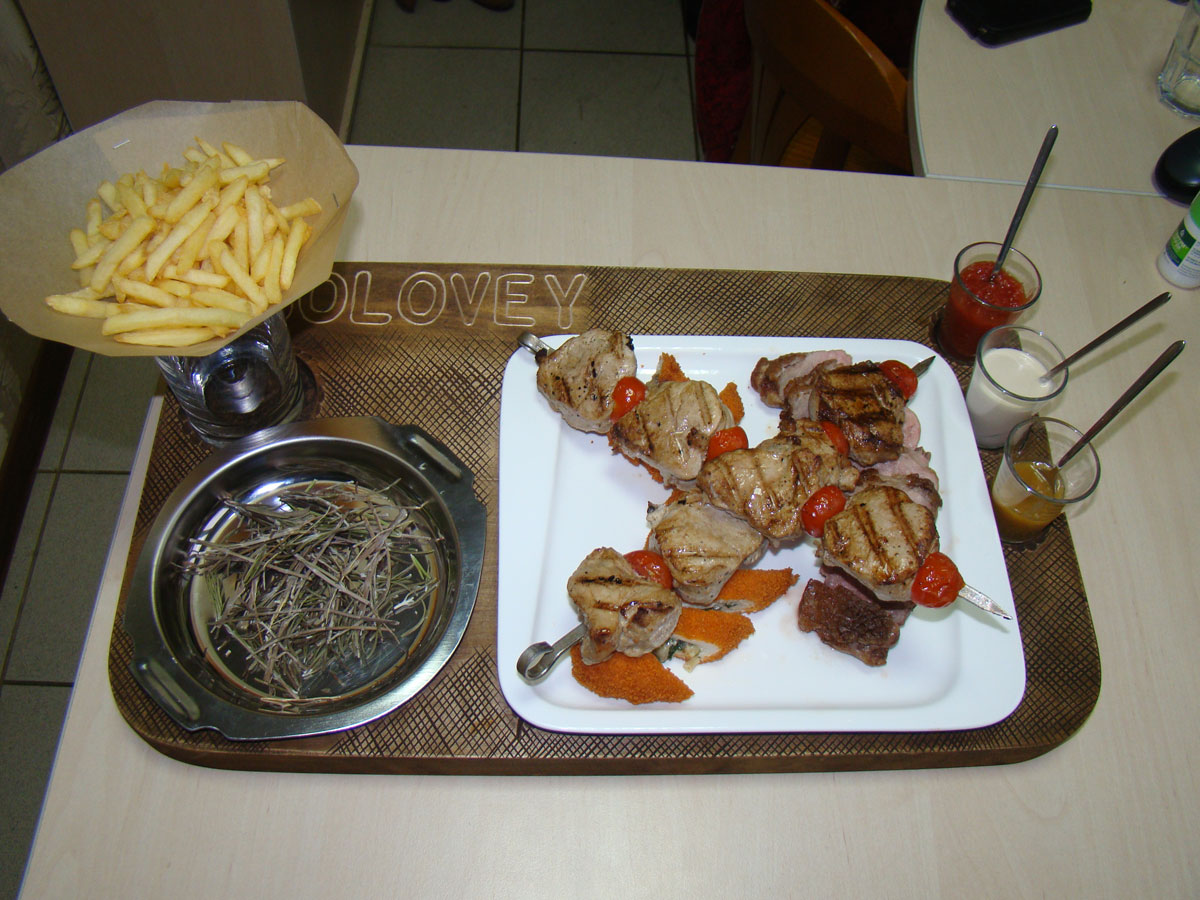 шашлык из нежной свиной вырезки, филе куриного бедра, котлета по-киевски в сочетании с тремя соусами и гарниром из картофеля фри (блюдо расчитано на 2 персоны)