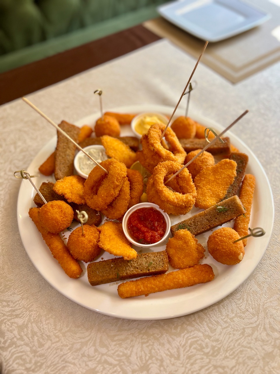 сырные крокеты, кольца кальмара в панировке, куриные наггетсы, сыр жаренный во фритюре, гренки ржаные с чесноком и зеленью с соусом Тар Тар, с сырным соусом, с томатным соусом