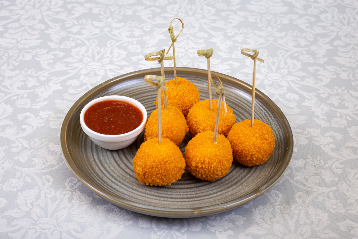 сырные крокеты на шпажках с чесночным соусом и сырокопчёной свининой подаются с томатным соусом