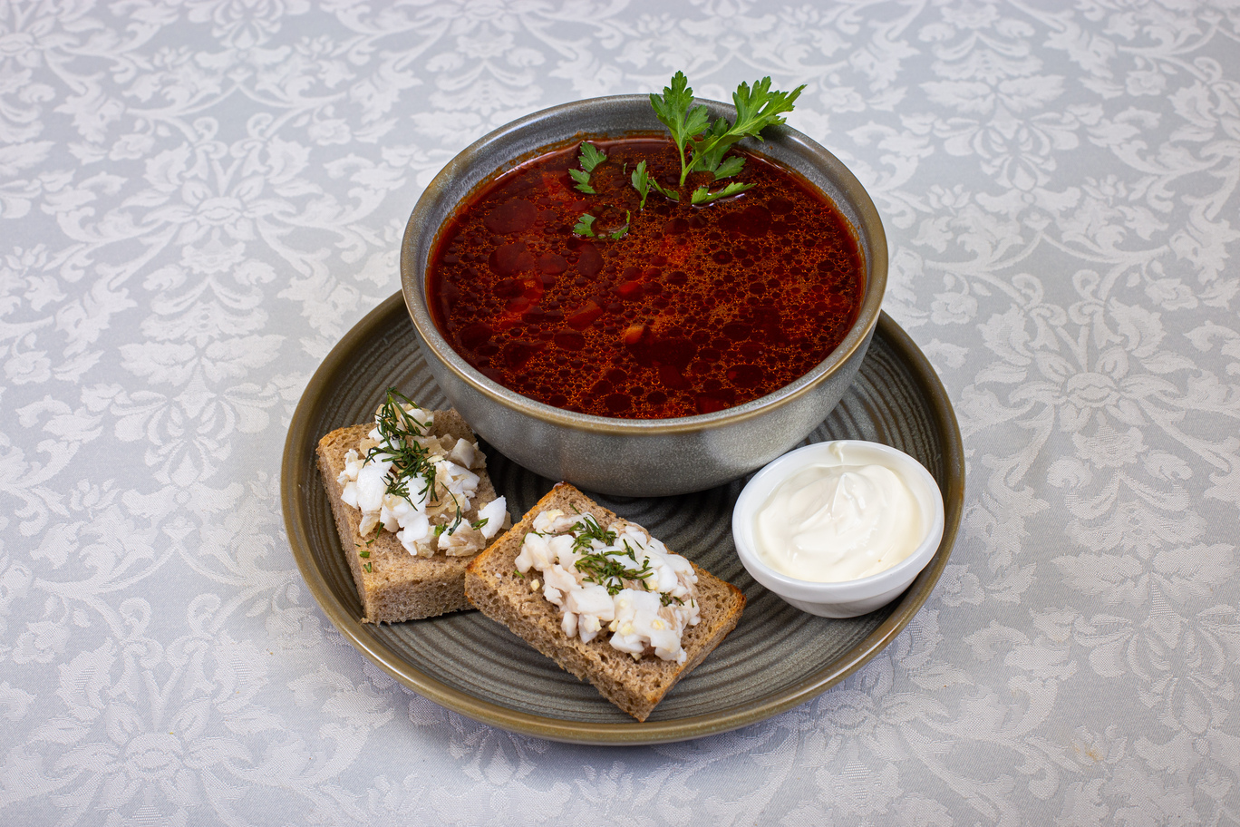 Борщ в горшочке с телятиной, подается с салом и сметаной