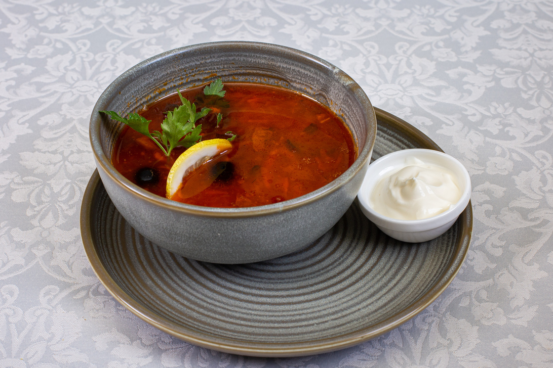Солянка из мясного ассорти - говяжьего языка, копченых карбоната, бекона, колбас - подается со сметаной