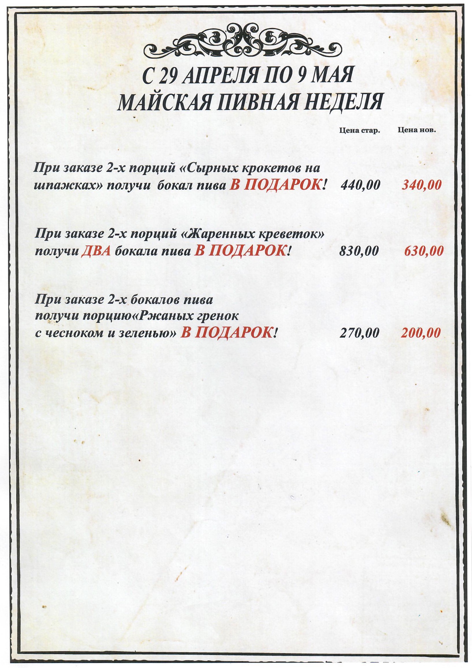 Майская пивная неделя! Вкусное предложение с 29 апреля по 9 мая!