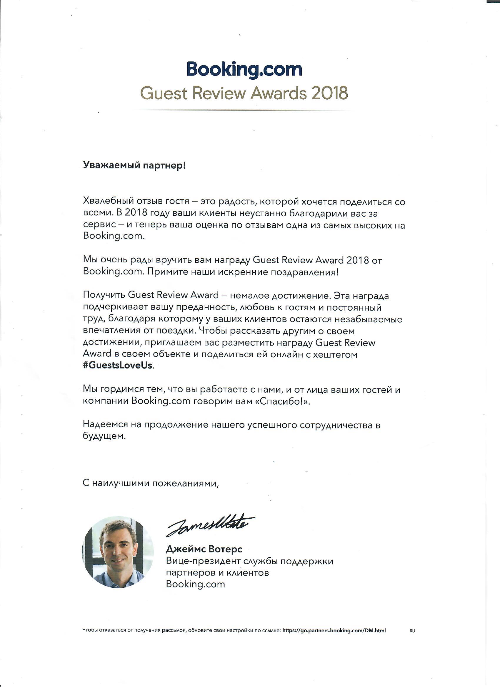 Мы искренне рады высокой похвале нашему труду и приложенным усилиям для создания максимального комфорта в нашей гостинице! Хотим выразить слова благодарности каждому клиенту и Booking.com за эту прекрасную награду, которая стала мощным стимулом для совершенствования всех сторон нашей деятельности!