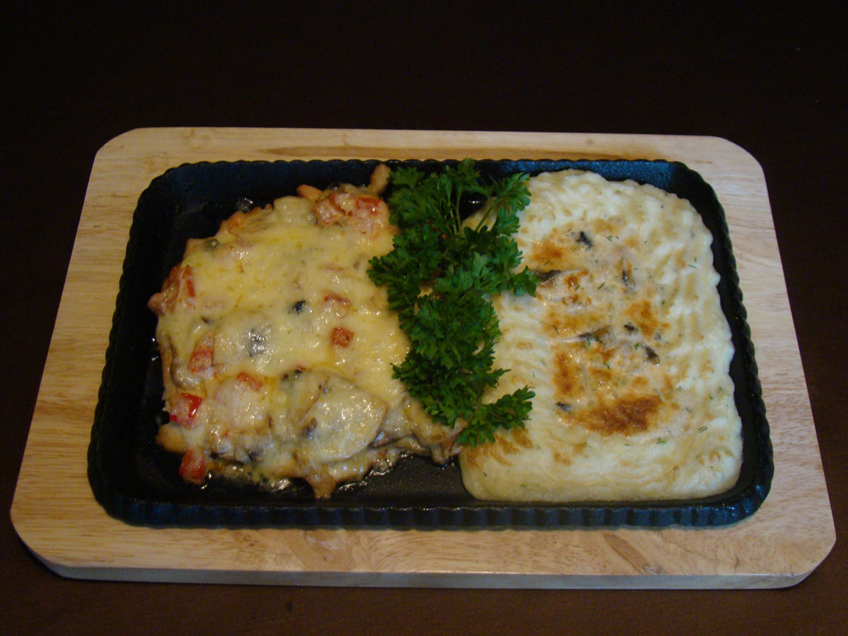 куриная отбивная запеченная на сковороде с картофельным пюре и грибным жульеном под сыром