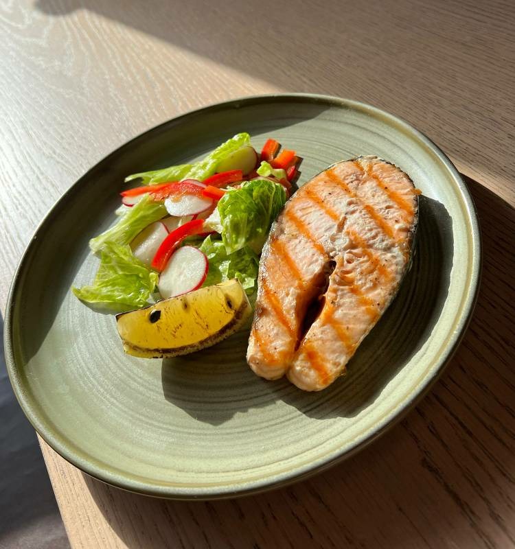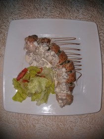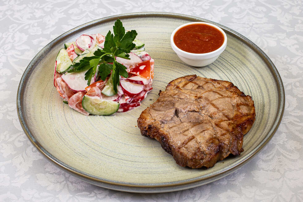 с салатом из свежих овощей в майонезной заправке. Цена блюда указана без гарнира.