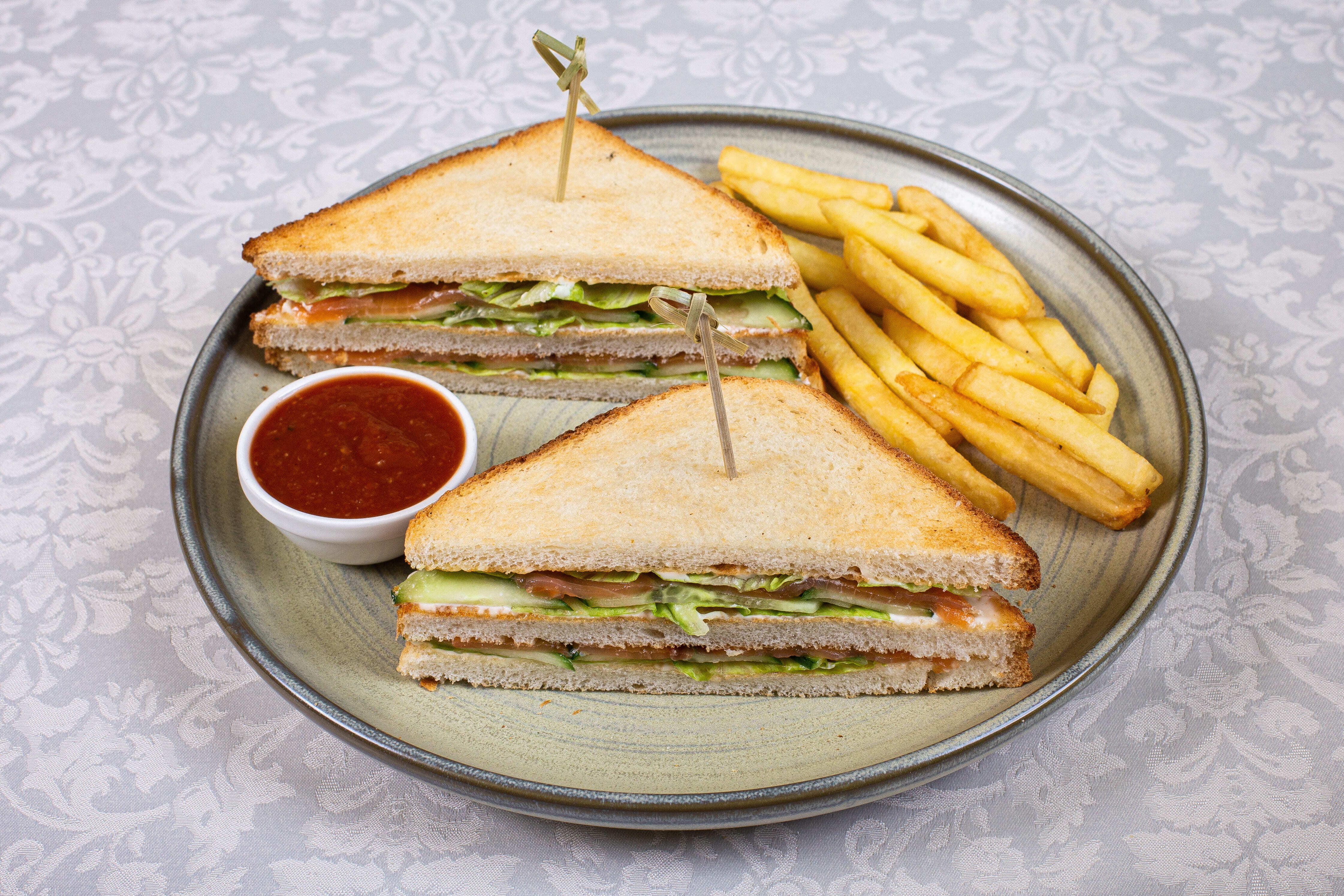 Сэндвич «Харрис» с картофелем фри, нежной солёной сёмгой и томатным соусом
