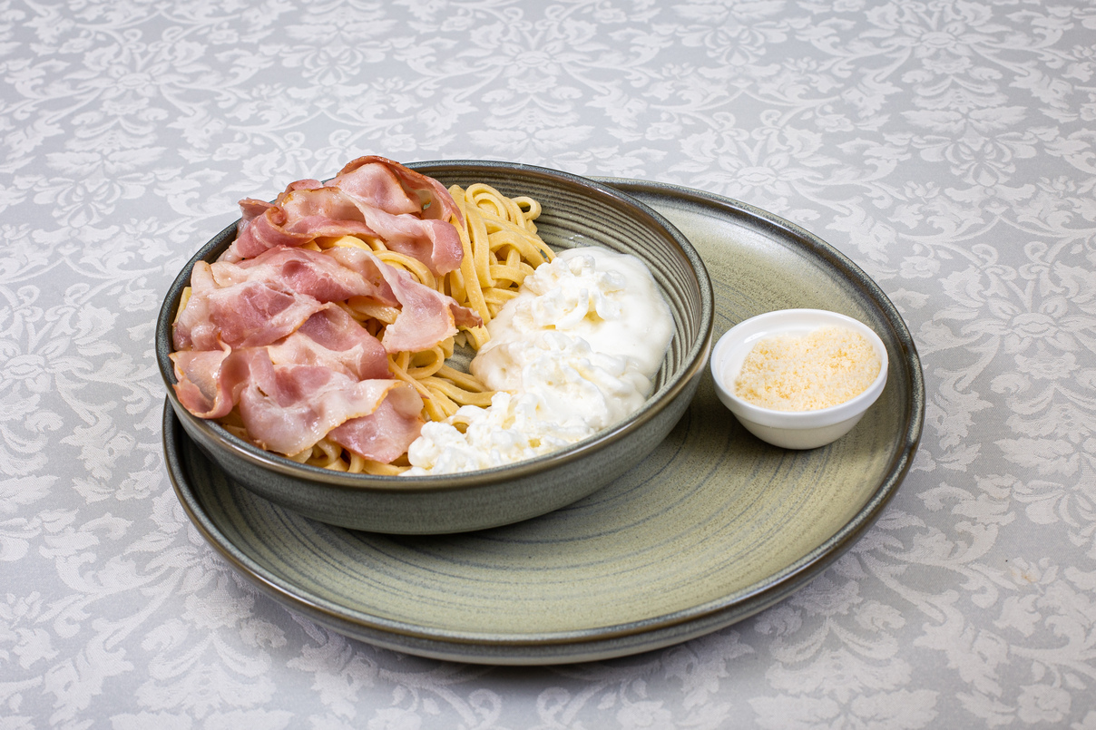 Паста собственного приготовления, сливочная эспума, пармезан, бекон