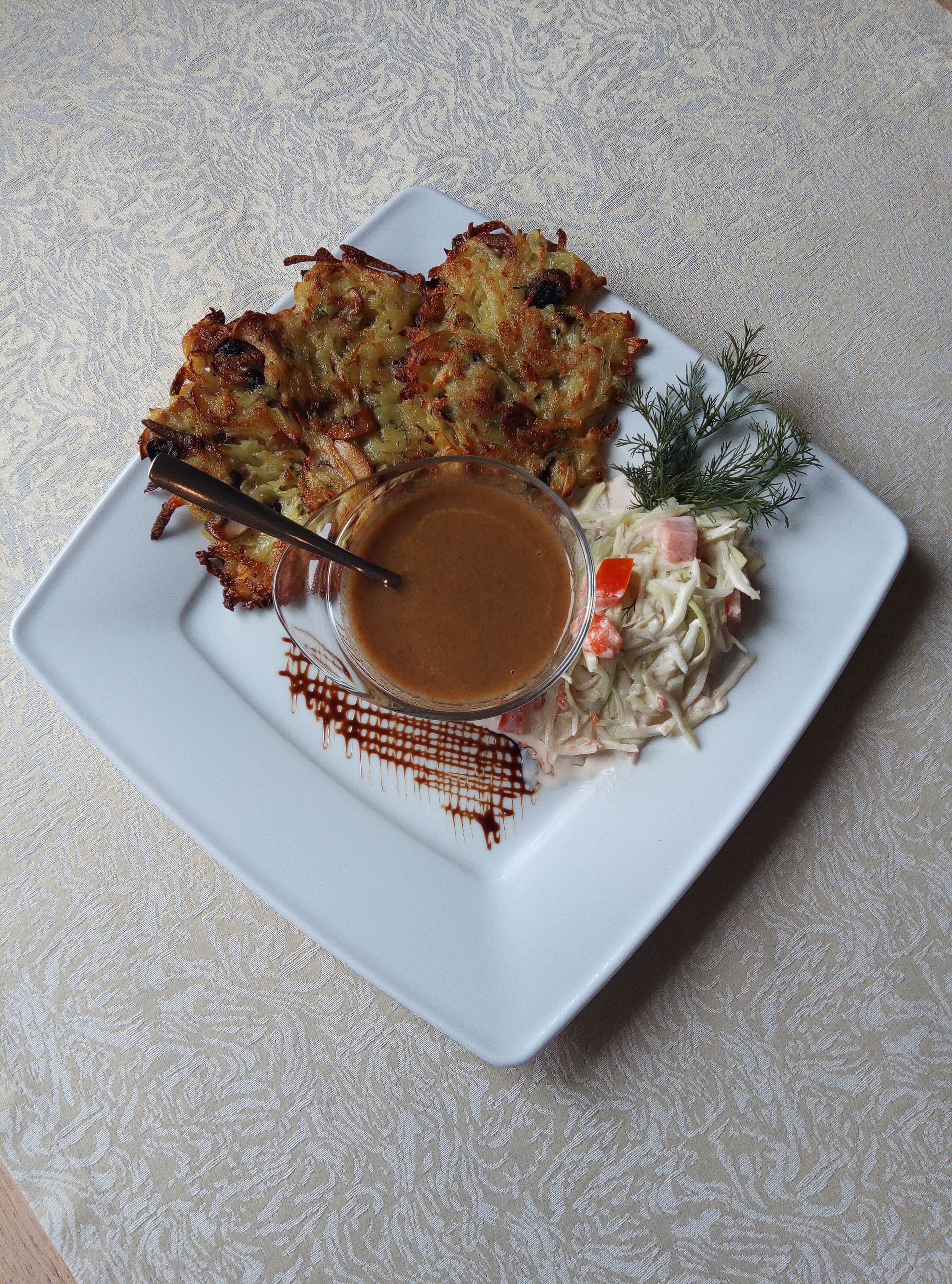 под грибной подливой с салатом из свежей капусты